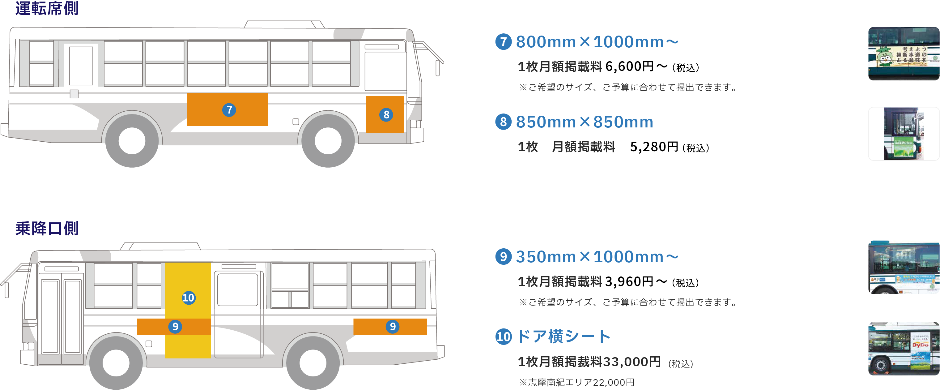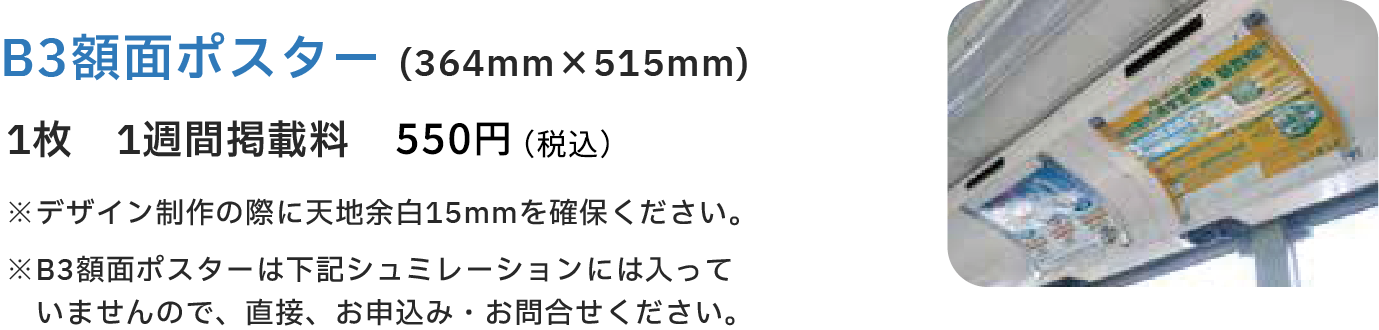 - バス広告の契約期間は1年(B3額面ポスターやバスマスクを除く)となりますが、短期契約も対応いたします。(シュミレーションには反映しておりません。掲載費用は1〜3ヵ月の場合5割増、4〜6ヵ月の場合2割増となります。)